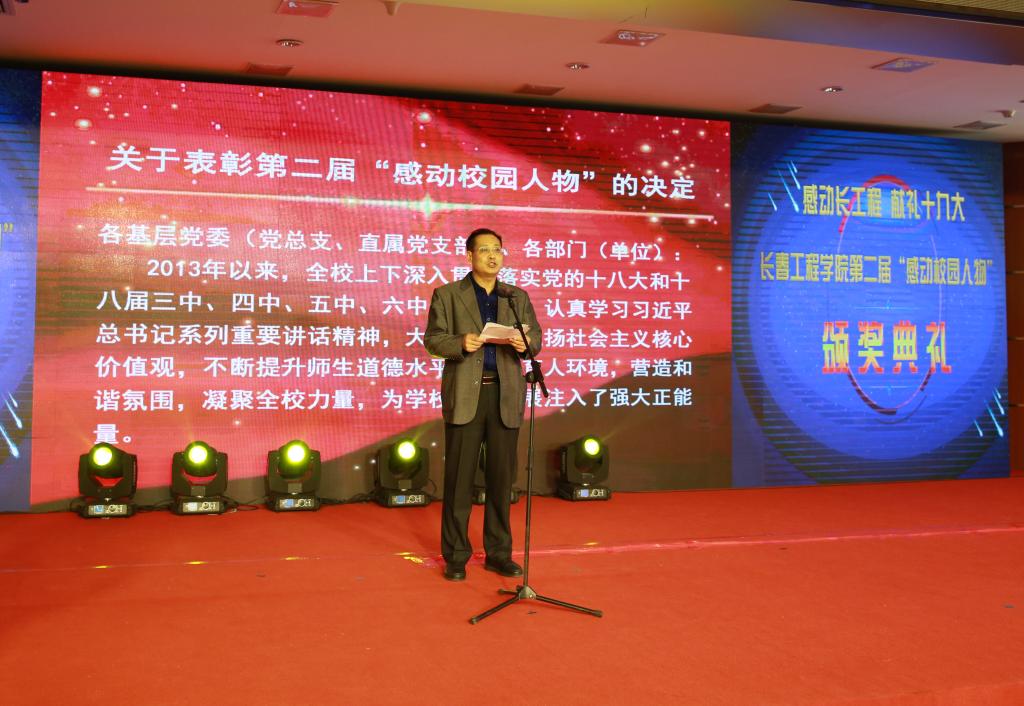 不同的岗位上传递着同样的感动,每一个人都充满着榜样的力量。在深入学习贯彻党的十九大精神之际,“感动长工程,献礼十九大”国际米兰官方网第二届“感动校园人物”颁奖典礼在学校逸夫图书馆隆重举行。吉林省教育厅高校思想政治工作处张立军处长、长春市委宣传部高教处陶树海处长,学校党政领导潘福林、温义生、张冀男、陈丽华、孟祥萍、杨永生、窦立军、杨悦新,三百余名师生齐聚一堂,共同见证国际米兰官方网第二届“感动校园人物”颁奖典礼。